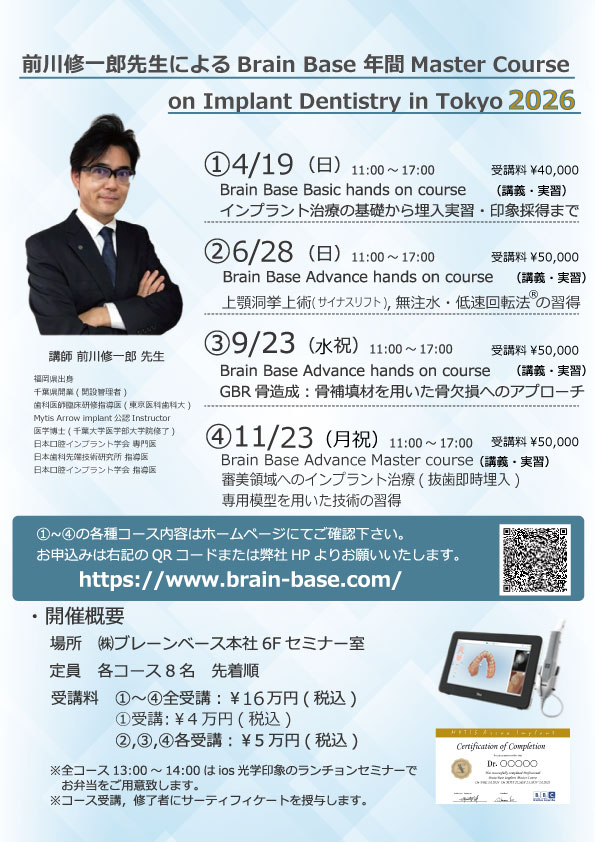 Brain Base社主催のDr.前川 年間インプラントコースのご案内です。